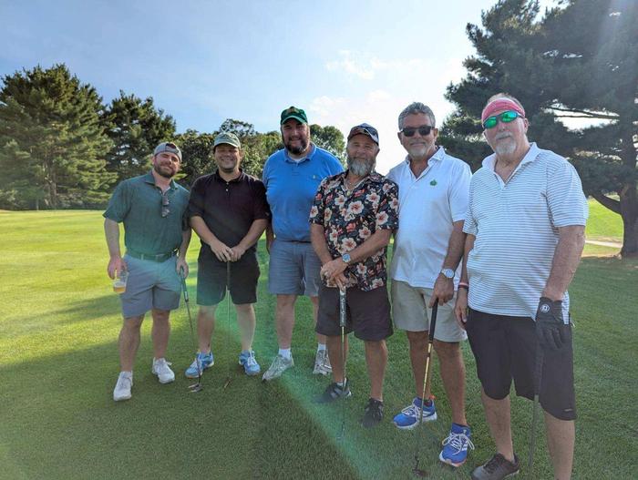 Putting Contest Participants at the 43rd Xavier Alumni Golf Classic: Pictured left to right is Tony Leone '06, Jake Schinas '14, Brendan Bell '05, Paul Poissant '75, Tom Sweeney '75, and Mike Schukis '75. All were involved in the putt-off that was won by Jake.