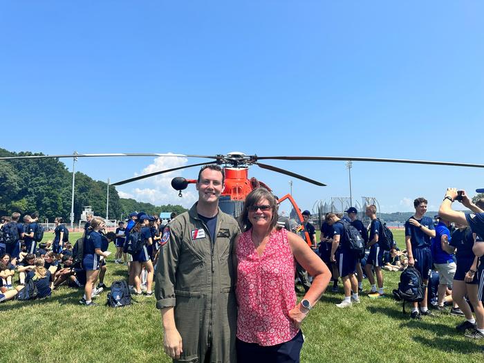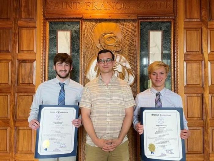 Top/Left: Lt. Robert “Bobby” McKenna ’11, and his mother, Caroline, in front of his aircraft while at USCGA, AIM Training in New London. Bottom/Right: Matt Whitaker ’23 Valedictorian, Robert Downes, Legislative Aide to State Senator Matt Lesser, and Tyler Keithan ‘23 Salutatorian, receiving citations for their academic success at Xavier High School. Matt is attending the University of Florida, and Tyler is off to Villanova this Fall.